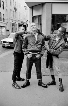 Three skinheads on Guernsey, in the Channel Islands, in 1986. Photographer: Marcus Graham/Pymca/Shutterstock